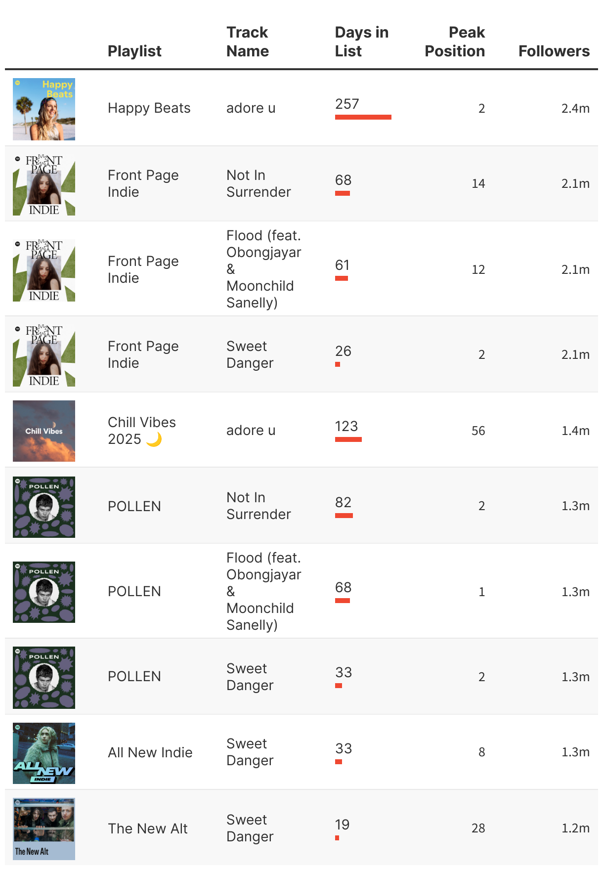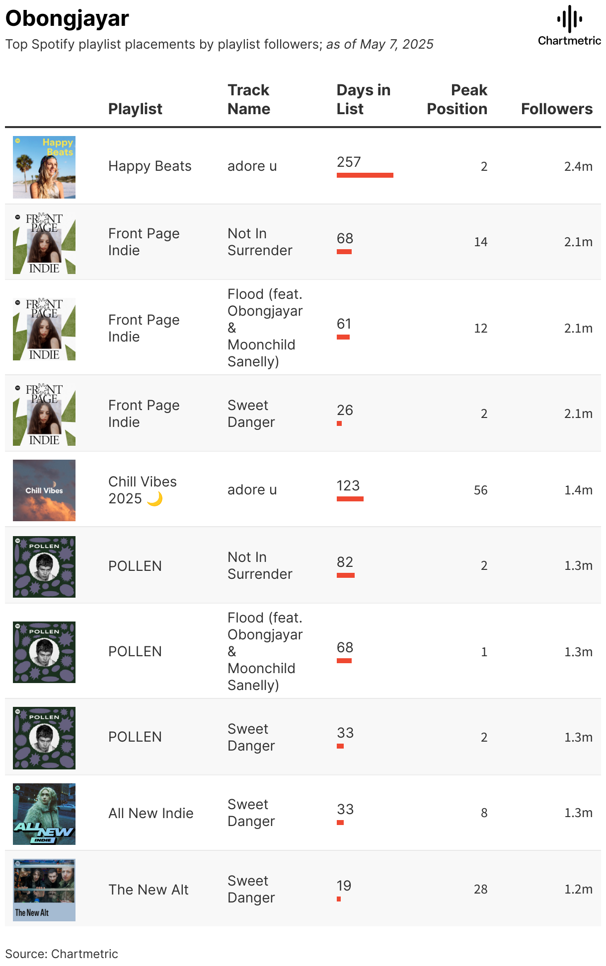 Top Spotify playlist placements by playlist followers; as of May 7, 2025