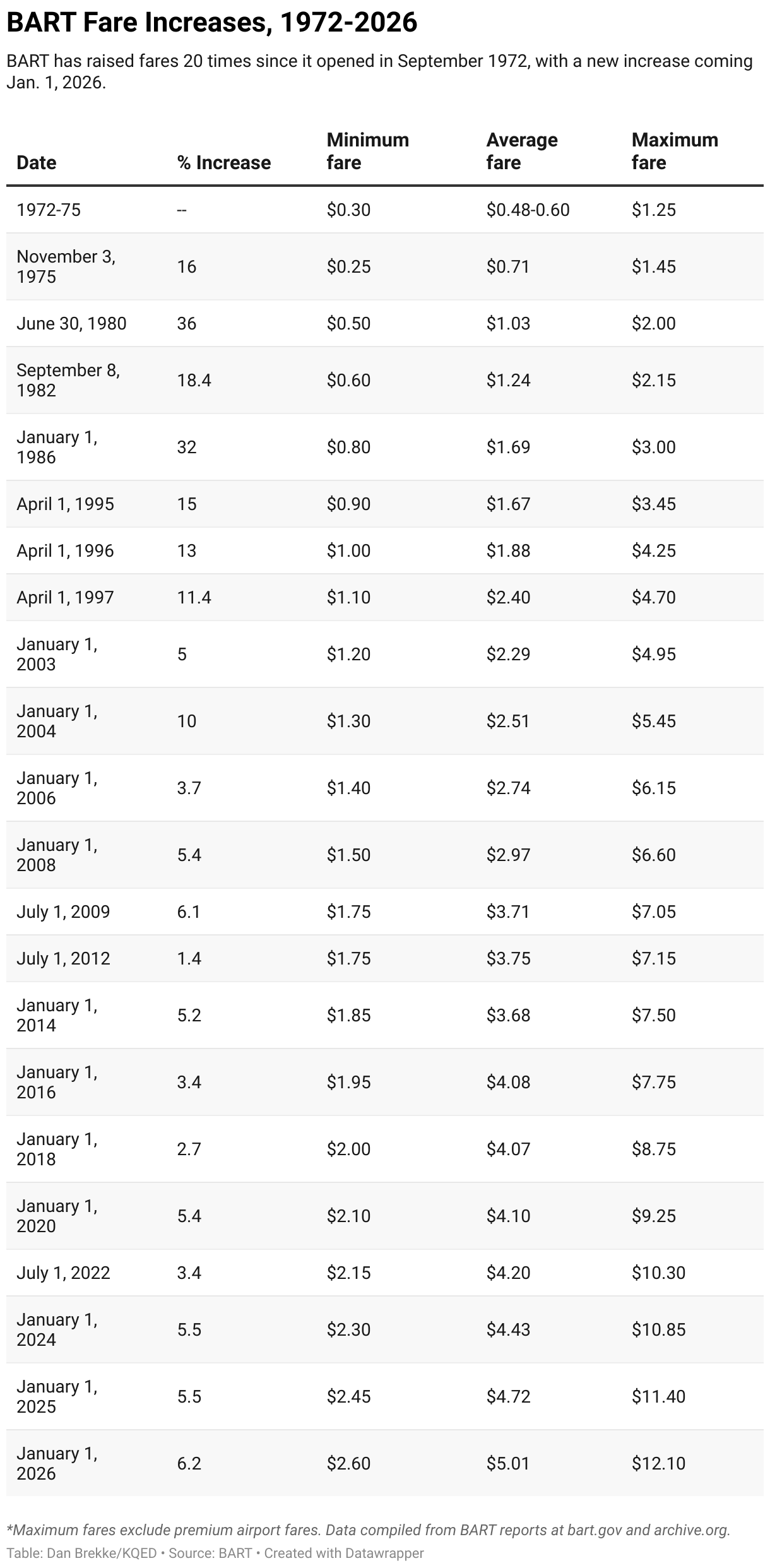 BART has raised fares 20 times since it opened in September 1972, with a new increase coming Jan. 1, 2026.
