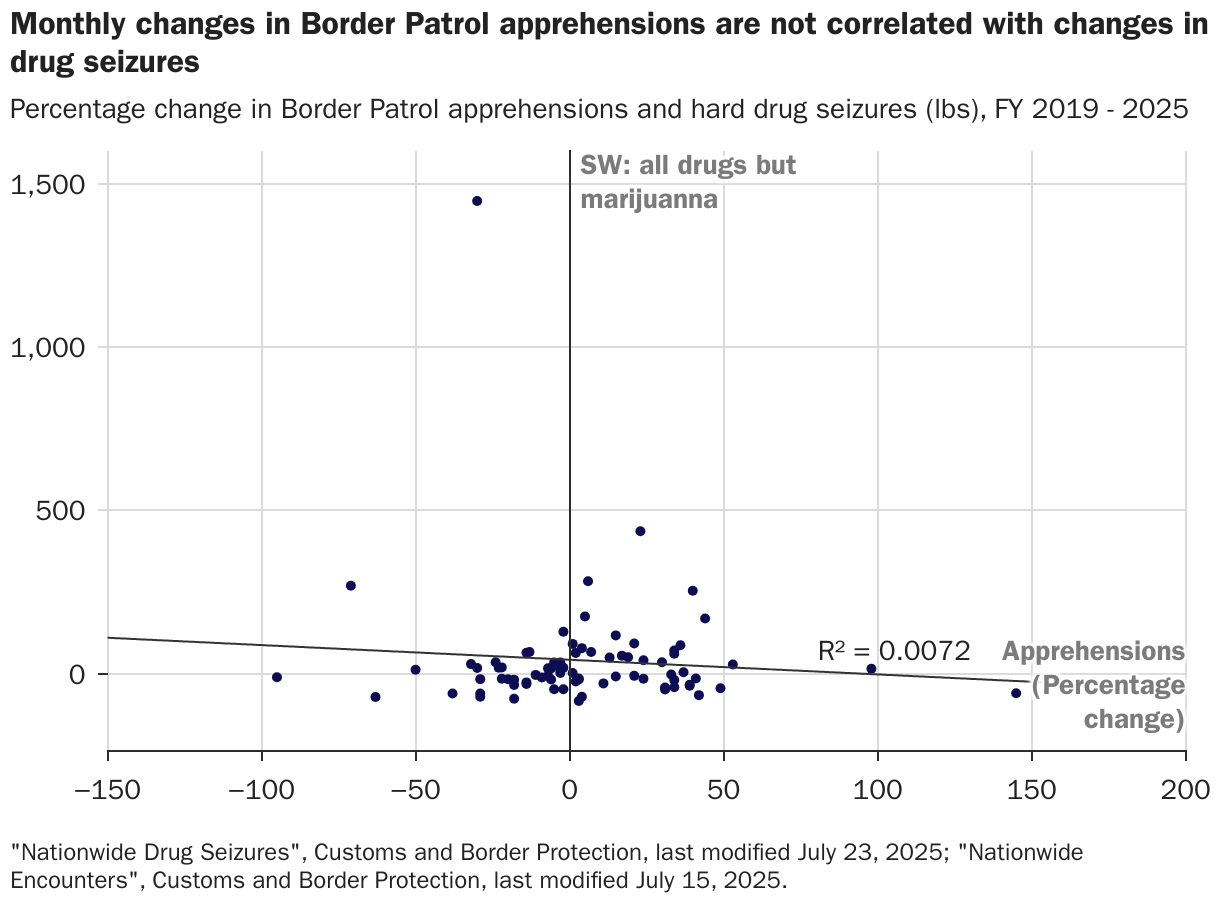 Percentage change in Border Patrol apprehensions and hard drug seizures (lbs), FY 2019 - 2025