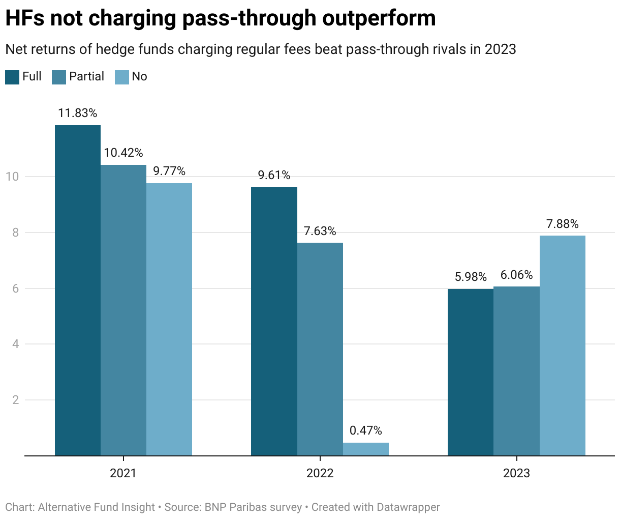 Net returns of hedge funds charging regular fees beat pass-through rivals in 2023