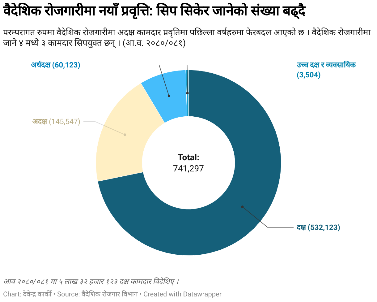 परम्परागत रुपमा वैदेशिक रोजगारीमा अदक्ष कामदार प्रवृतिमा पछिल्ला वर्षहरुमा फेरबदल आएको छ । वैदेशिक रोजगारीमा जाने ४ मध्ये ३ कामदार सिपयुक्त छन् । (आ.व. २०८०/०८१)