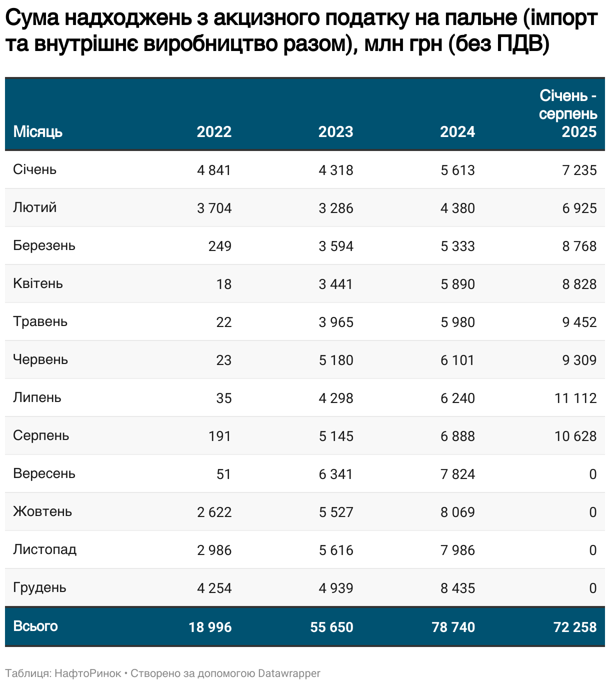 Сума надходжень з акцизного податку на пальне (імпорт та внутрішнє виробництво разом), млн грн (без ПДВ)
