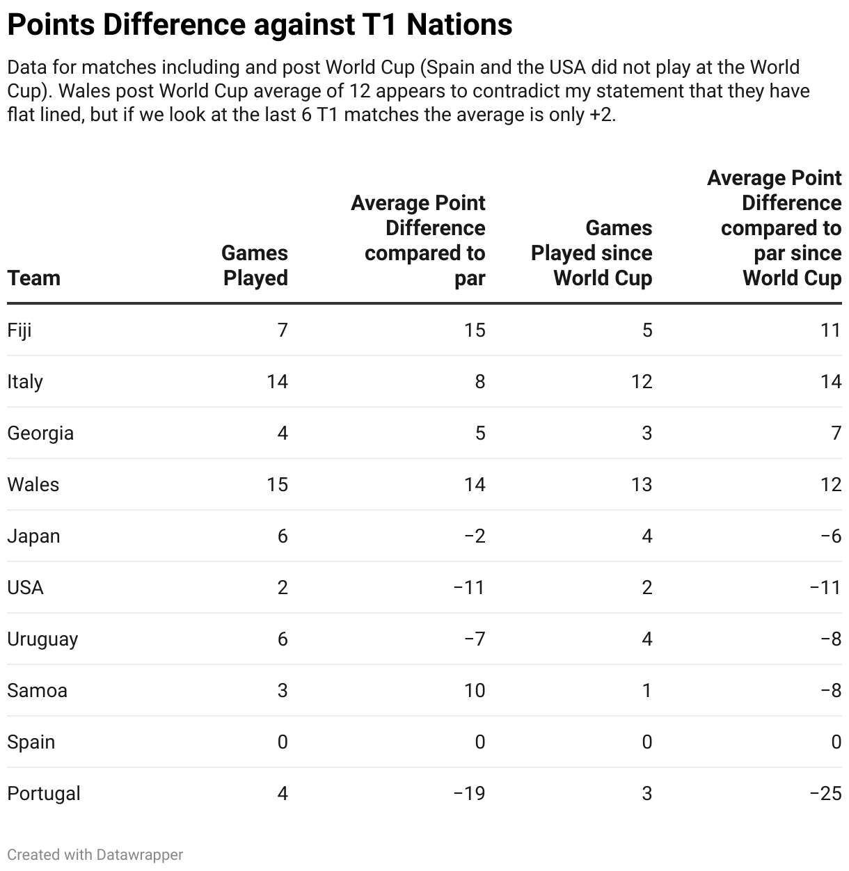 Data for matches including and post World Cup (Spain and the USA did not play at the World Cup). Wales post World Cup average of 12 appears to contradict my statement that they have flat lined, but if we look at the last 6 T1 matches the average is only +2.