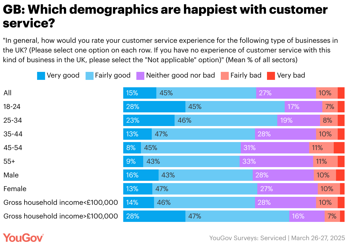 "In general, how would you rate your customer service experience for the following type of businesses in the UK? (Please select one option on each row. If you have no experience of customer service with this kind of business in the UK, please select the "Not applicable" option)" (Mean % of all sectors)