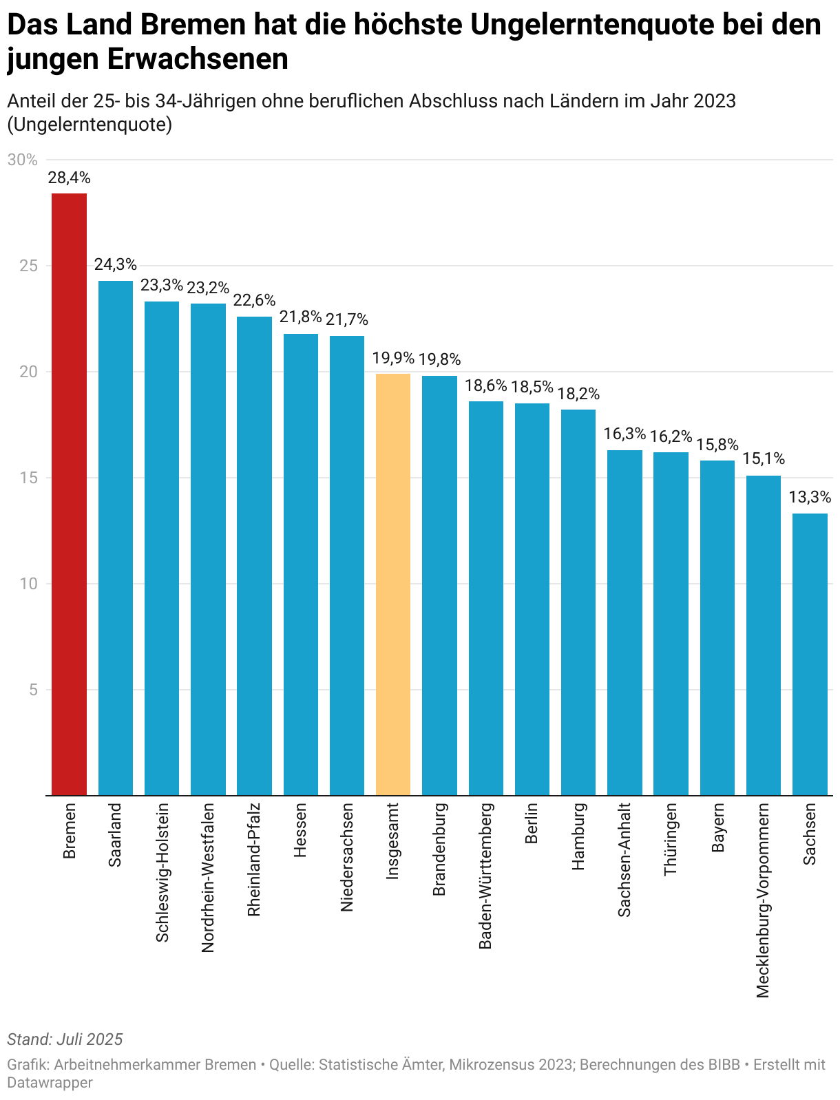 Anteil der 25- bis 34-Jährigen ohne beruflichen Abschluss nach Ländern im Jahr 2023 (Ungelerntenquote)