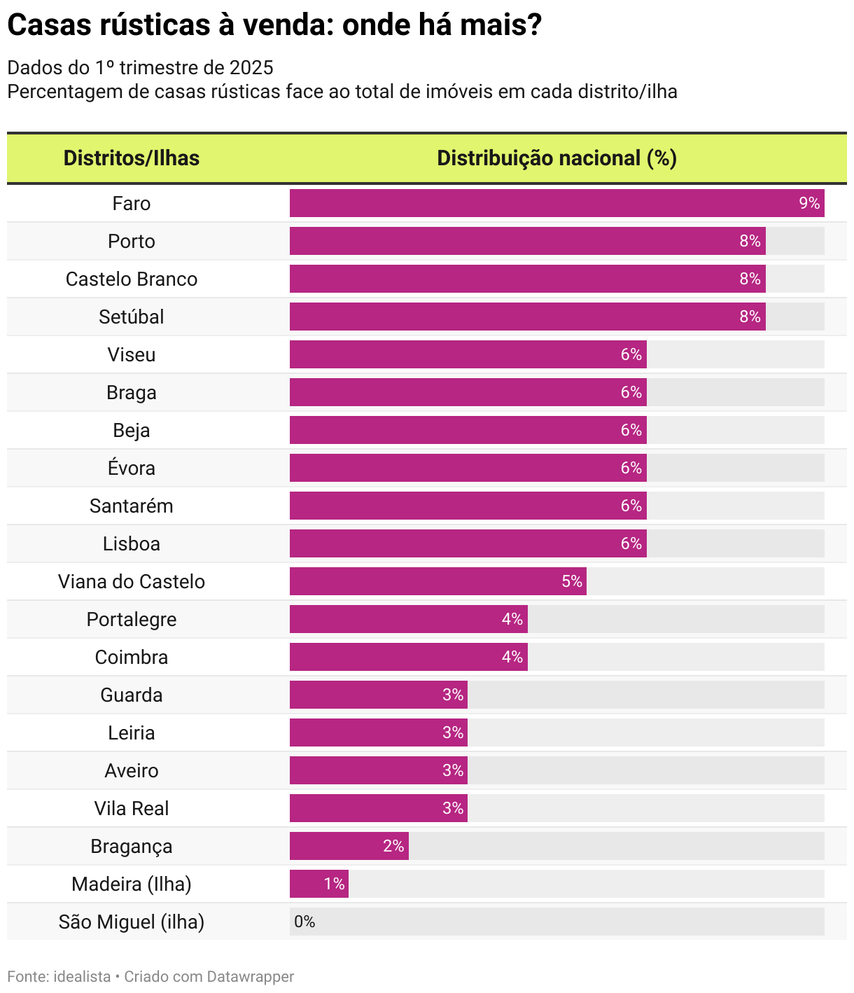 Dados do 1º trimestre de 2025 Percentagem de casas rústicas face ao total de imóveis em cada distrito/ilha