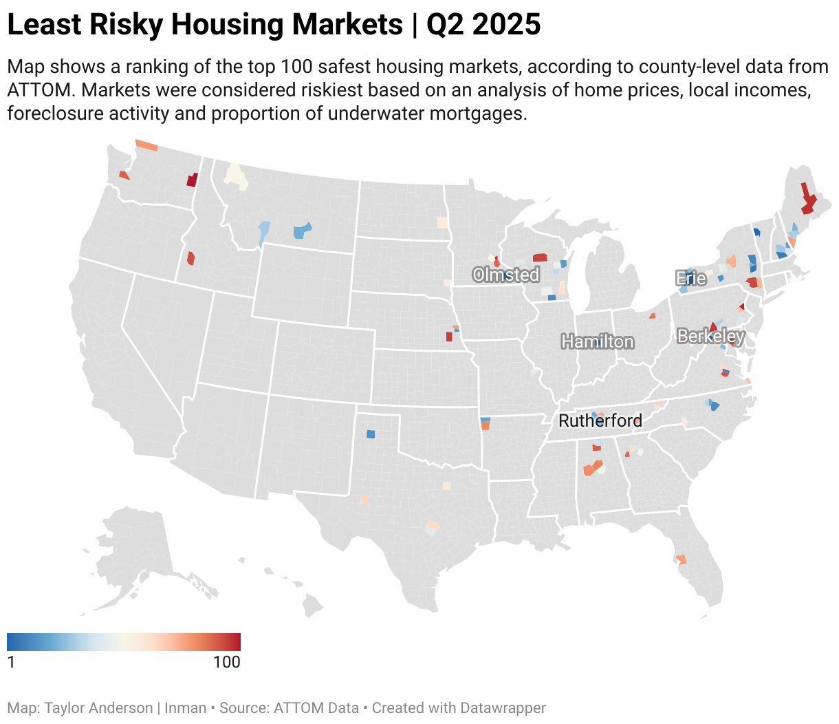 Map shows a ranking of the top 100 safest housing markets, according to county-level data from ATTOM. Markets were considered riskiest based on an analysis of home prices, local incomes, foreclosure activity and proportion of underwater mortgages.