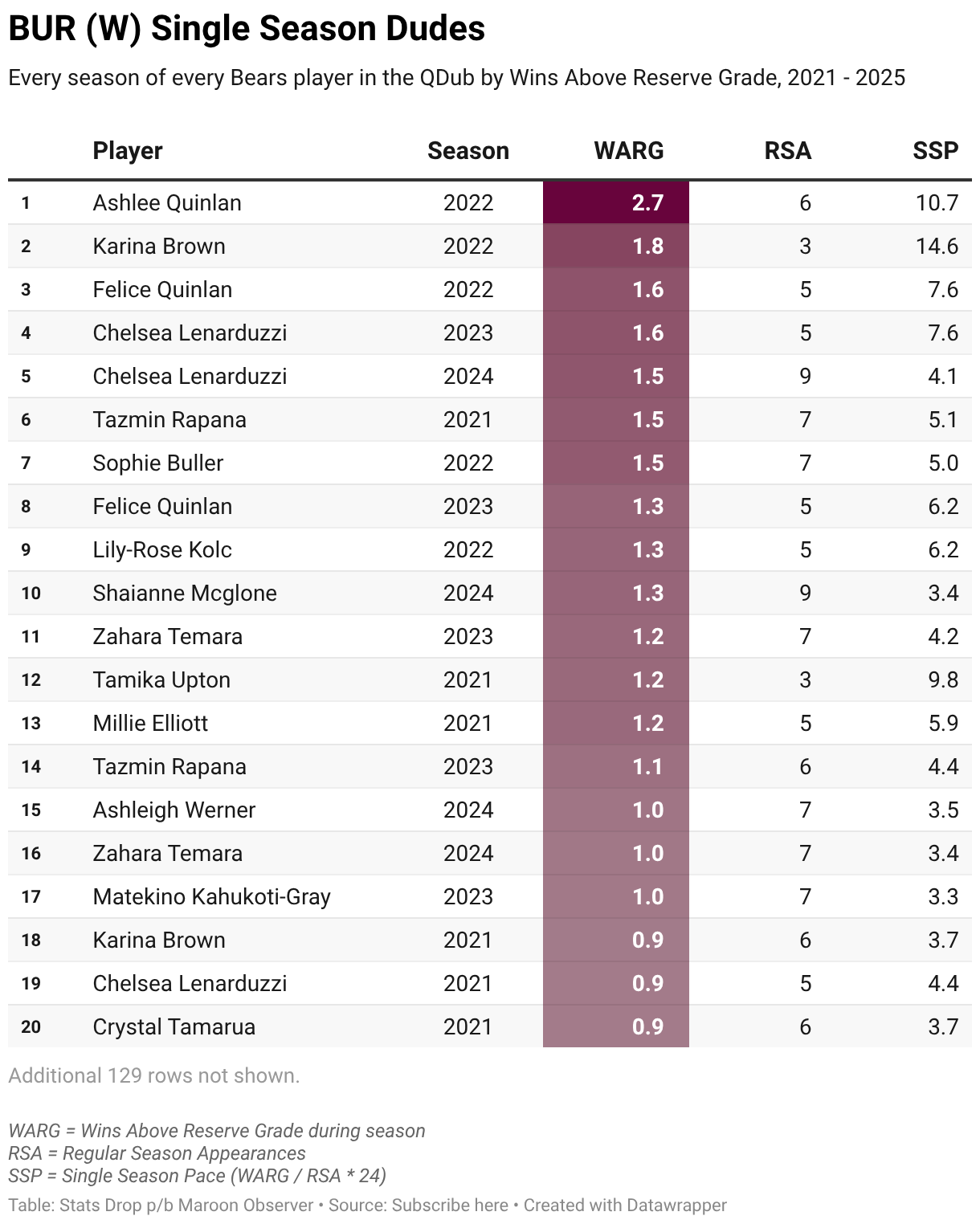 Every season of every Bears player in the QDub by Wins Above Reserve Grade, 2021 - 2025