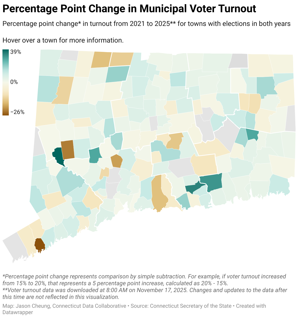 Percentage point change* in turnout from 2021 to 2025** for towns with elections in both years Hover over a town for more information.