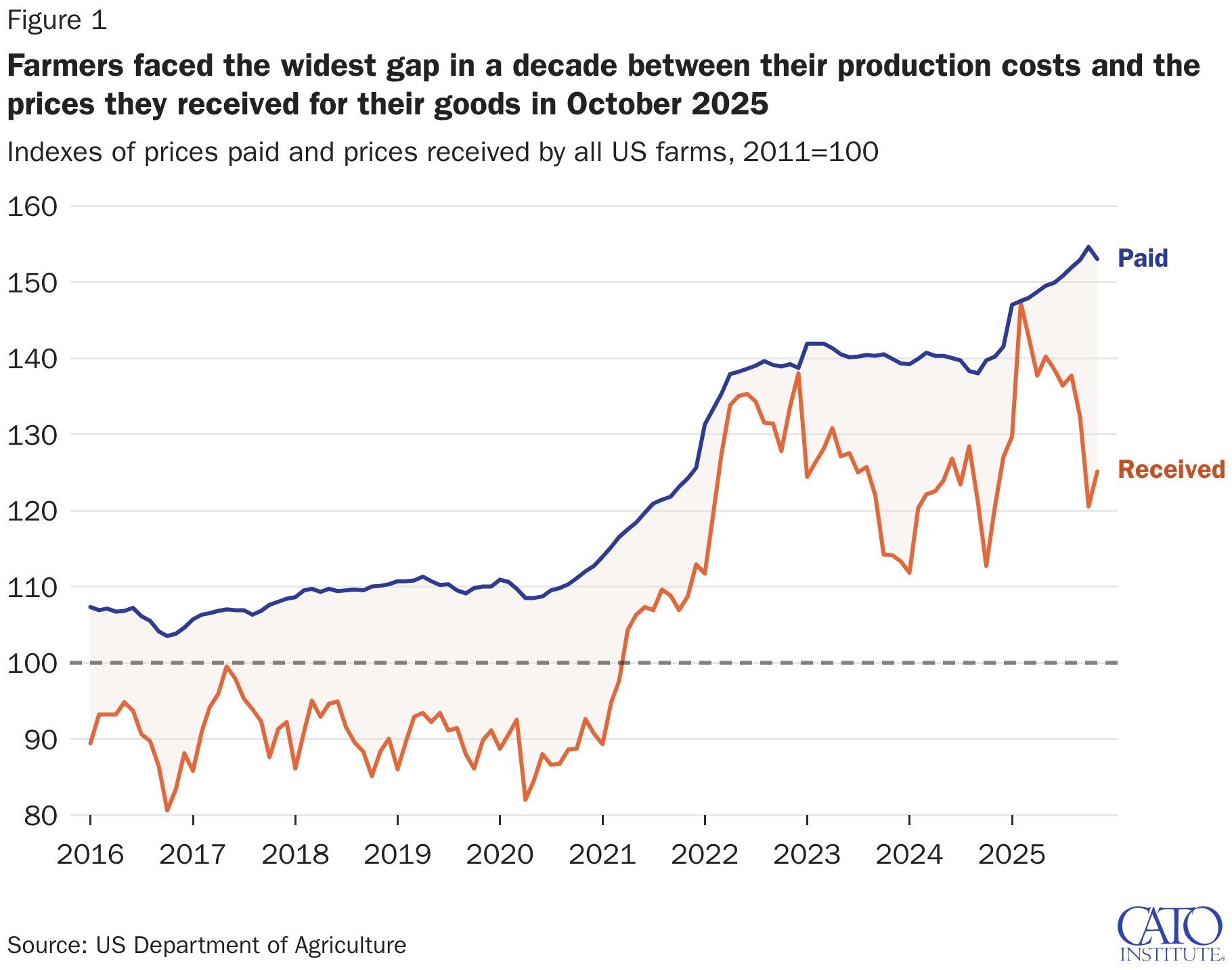 Indexes of prices paid and prices received by all US farms, 2011=100