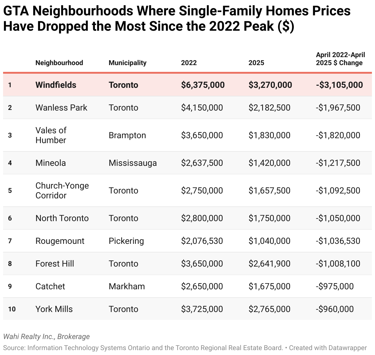 GTA Neighbourhoods Where Single-Family Home Prices Have Dropped the Most Since the 2022 Peak ($)