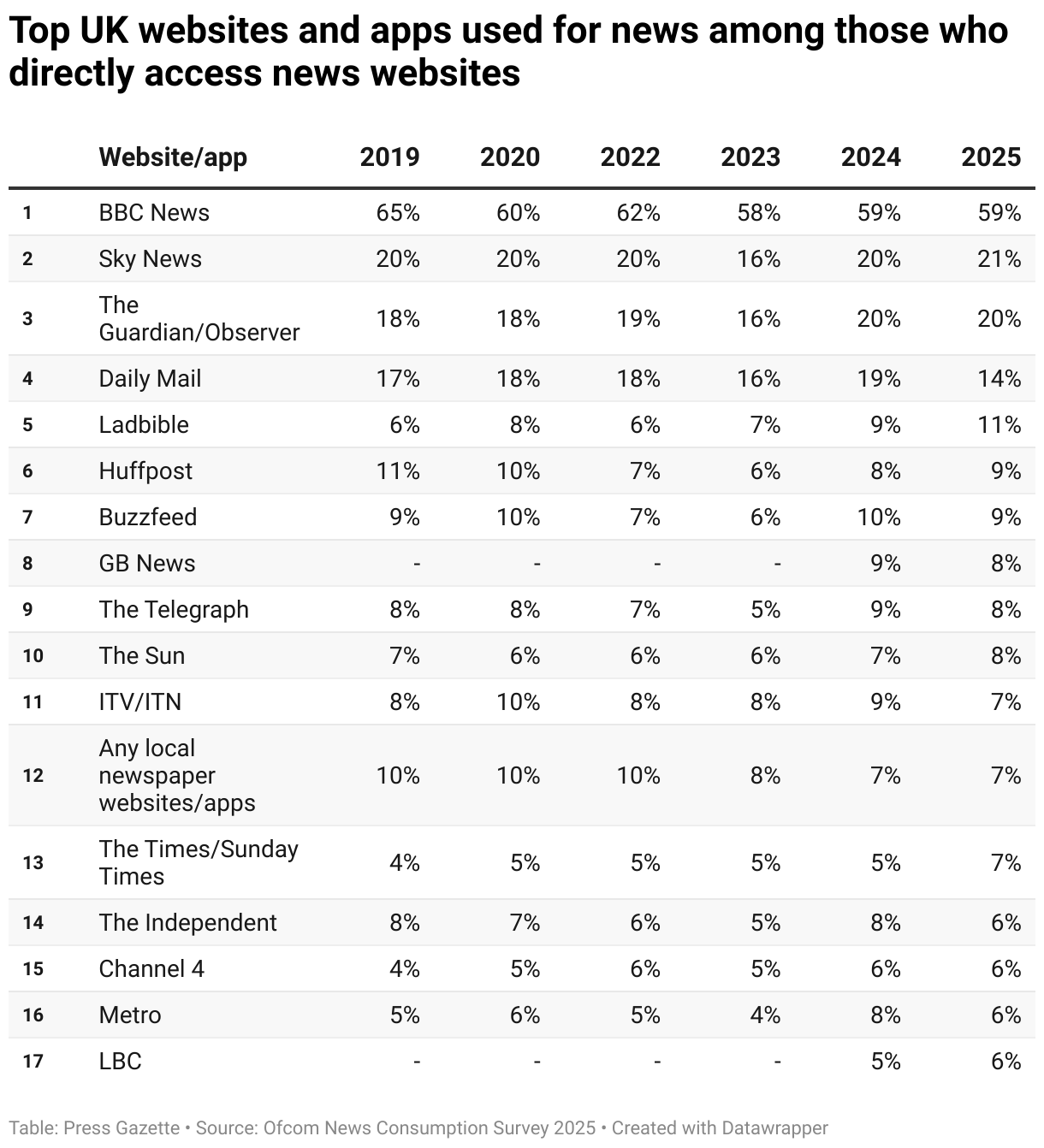 Top UK websites and apps used for news among those who directly access news websites