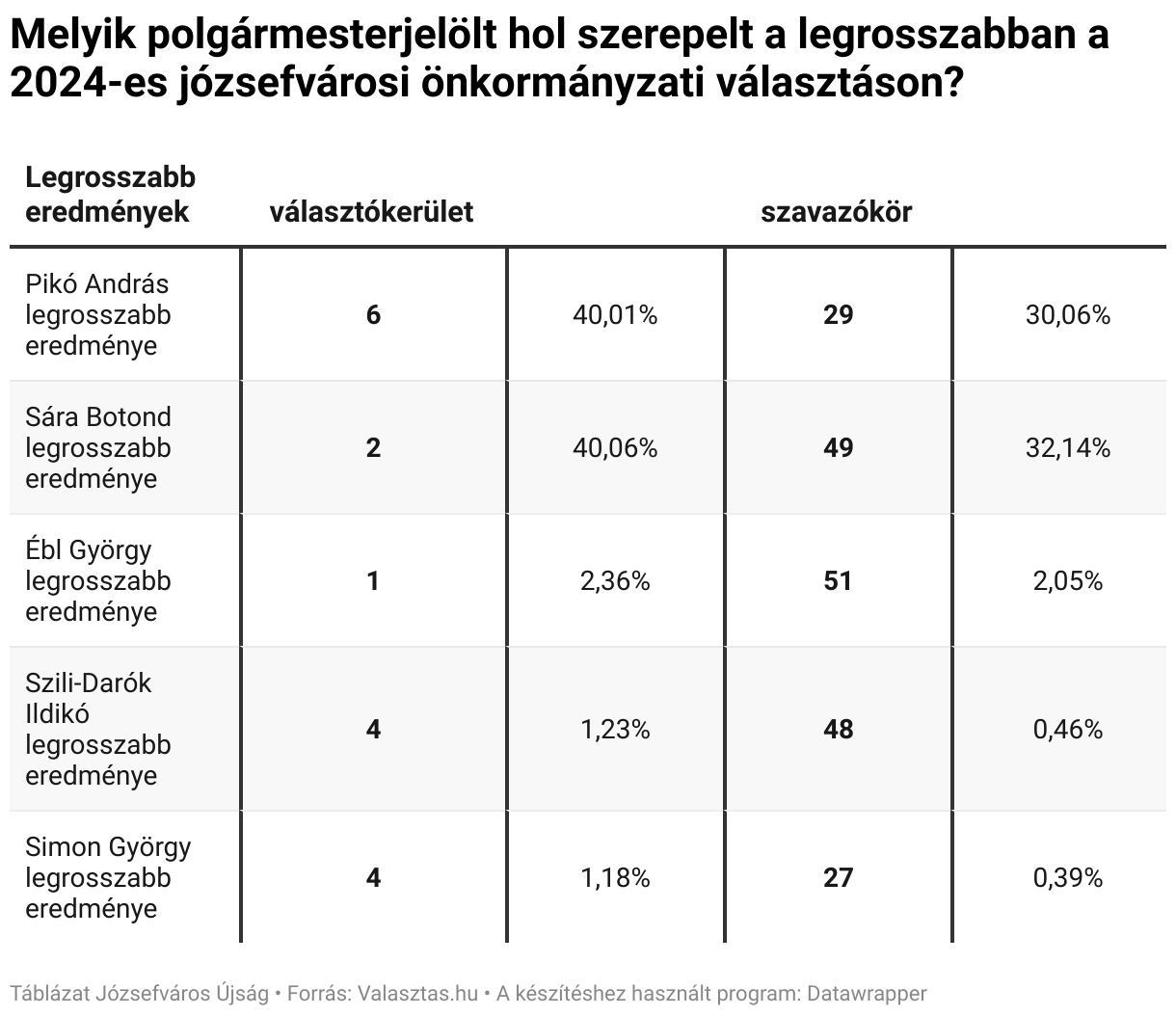 Melyik polgármesterjelölt hol szerepelt a legrosszabban a 2024-es józsefvárosi önkormányzati választáson?