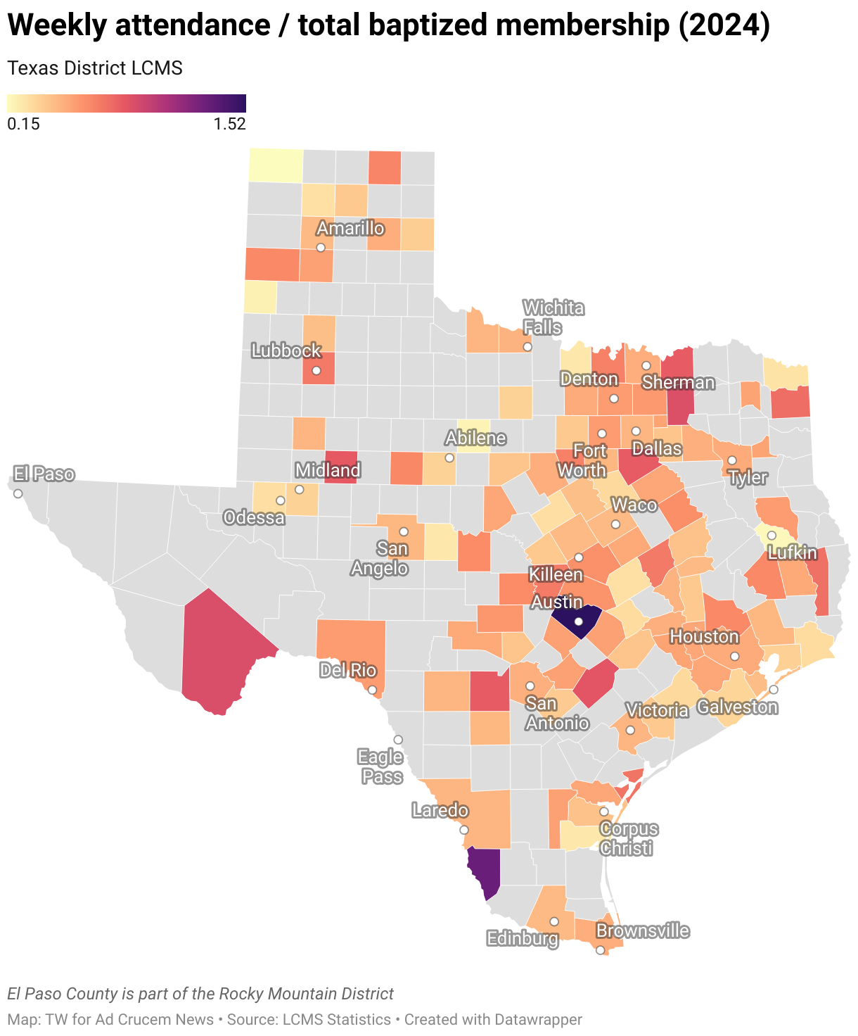 Weekly attendance / total baptized membership (2024)