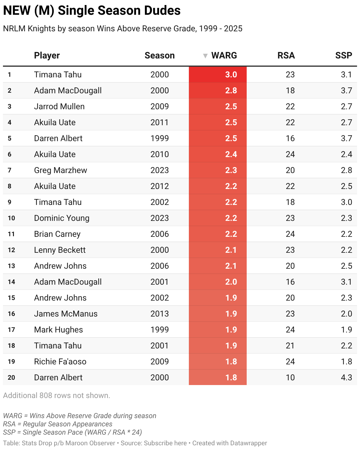 NRLM Knights by season Wins Above Reserve Grade, 1999 - 2025