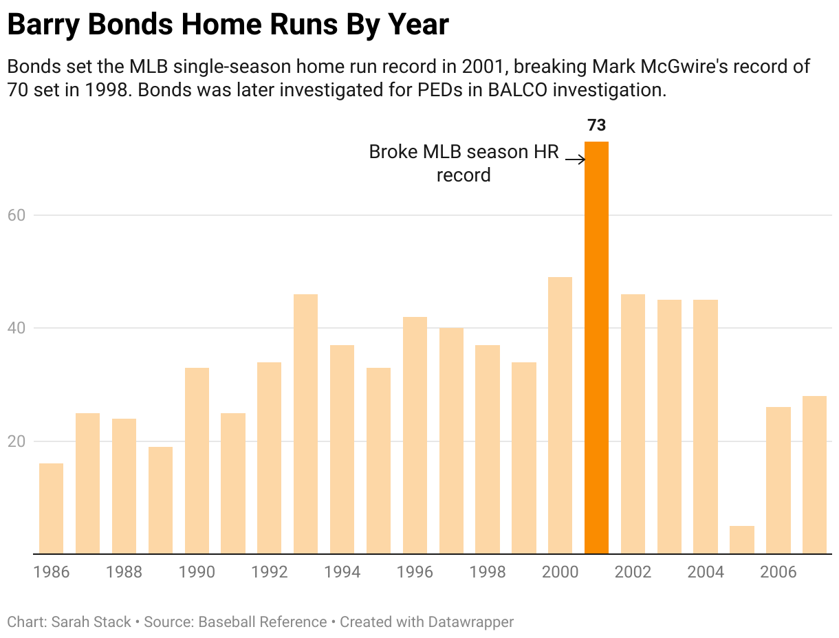 Barry Bonds Home Runs By Year Graphic. Bonds set the MLB single-season home run record in 2001, breaking Mark McGwire's record of 70 set in 1998. Bonds was later investigated for PEDs in BALCO investigation.