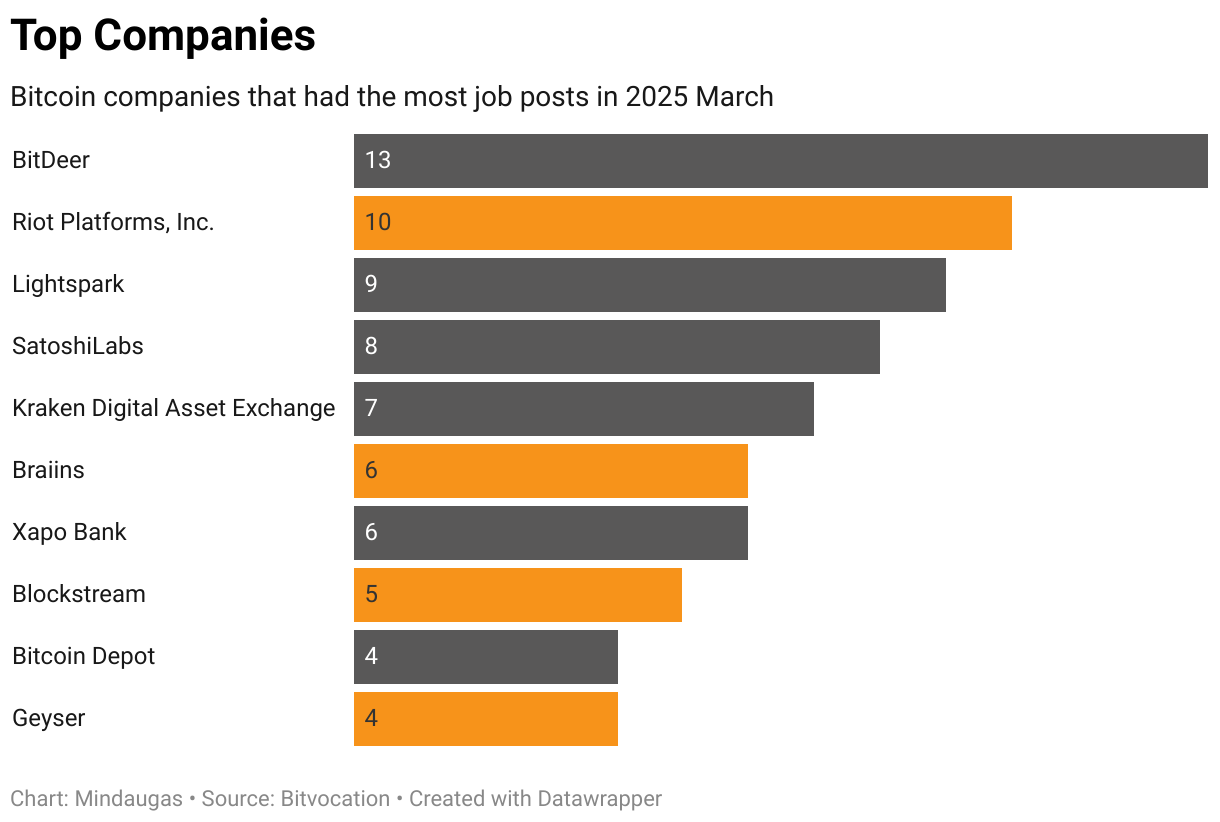 Bitcoin companies that had the most job posts in 2025 March