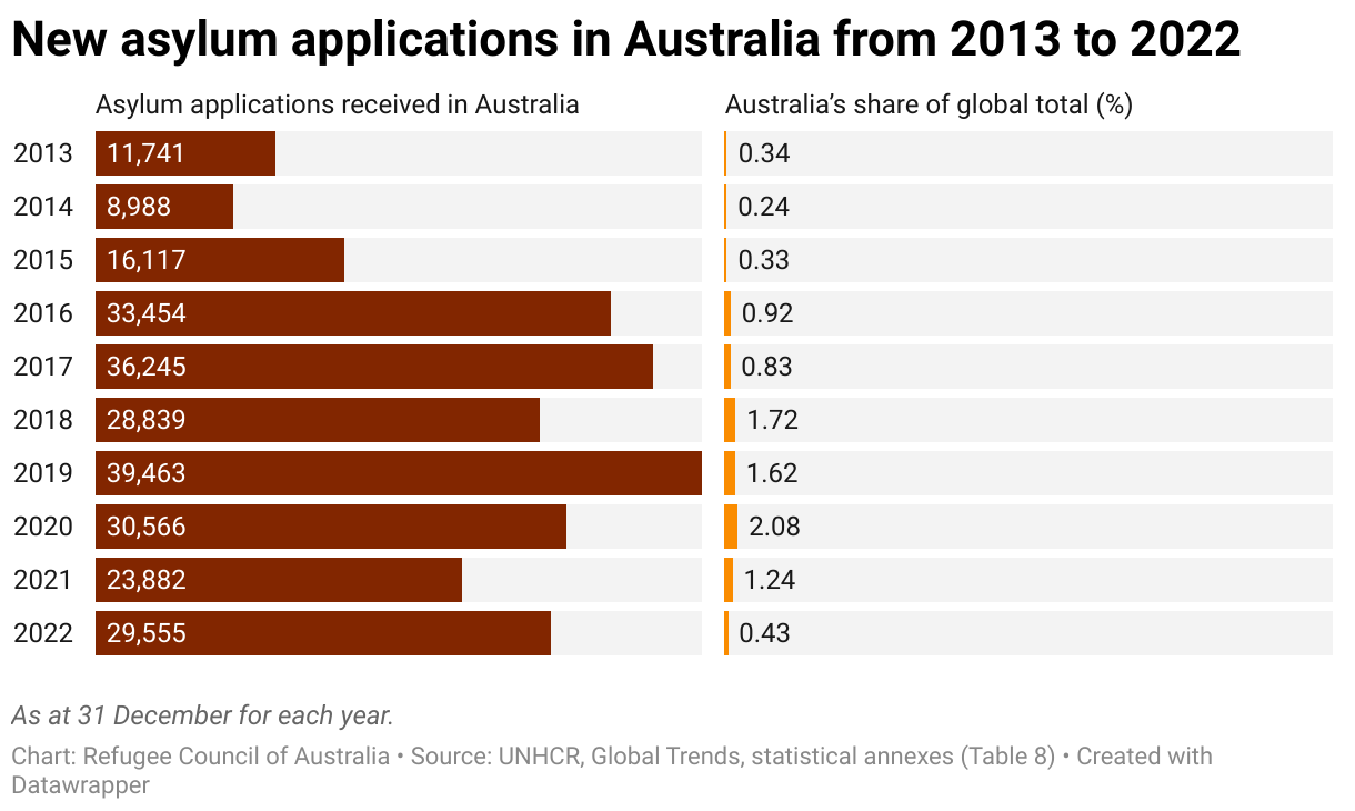 Split bar chart showing number of asylum applicatiosn received in Australia compared to share of global total