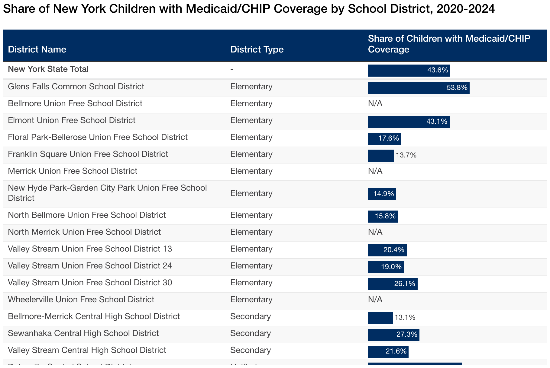 Share of New York Children with Medicaid/CHIP Coverage by School District, 2020-2024