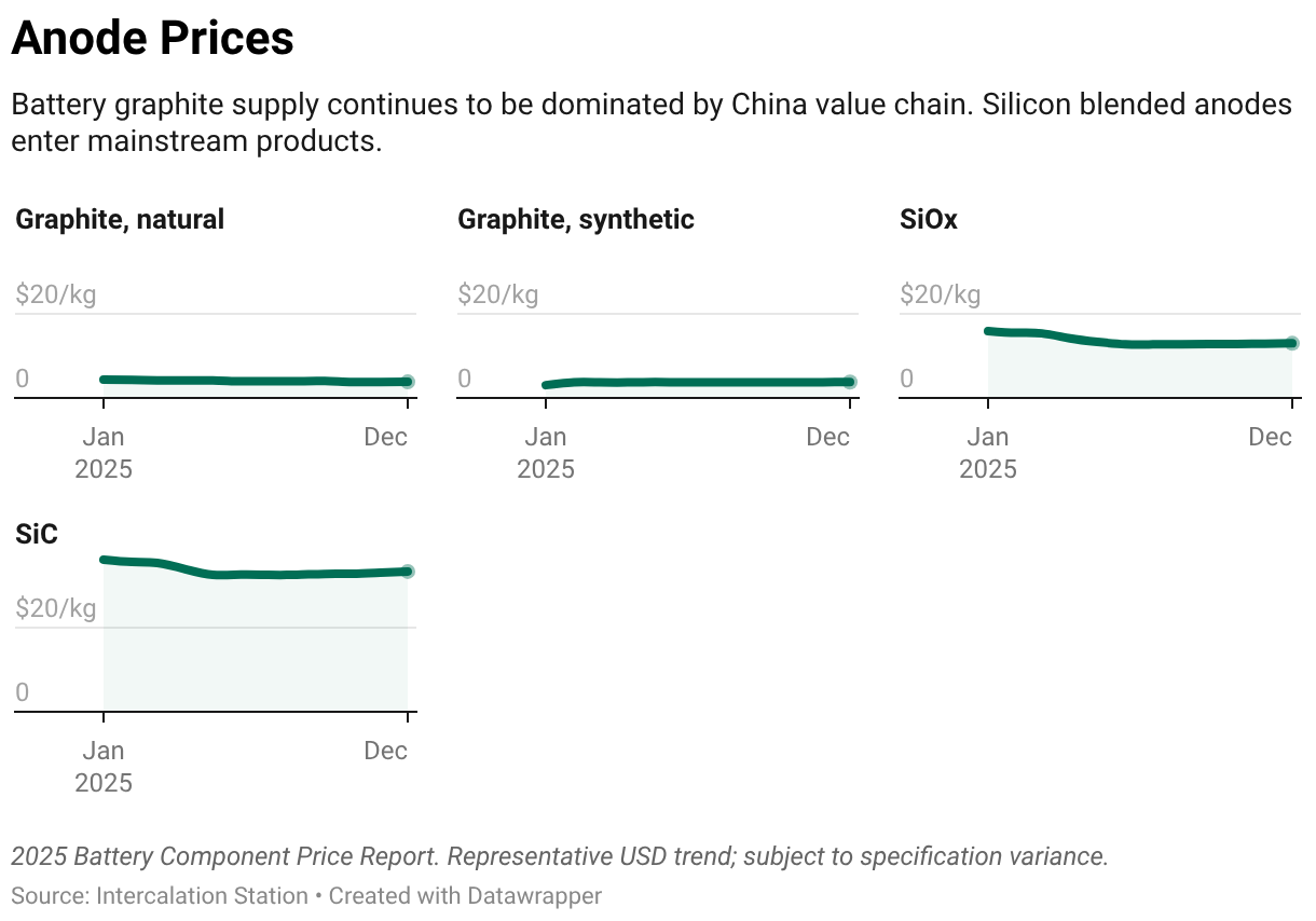 Battery graphite supply continues to be dominated by China value chain. Silicon blended anodes enter mainstream products.