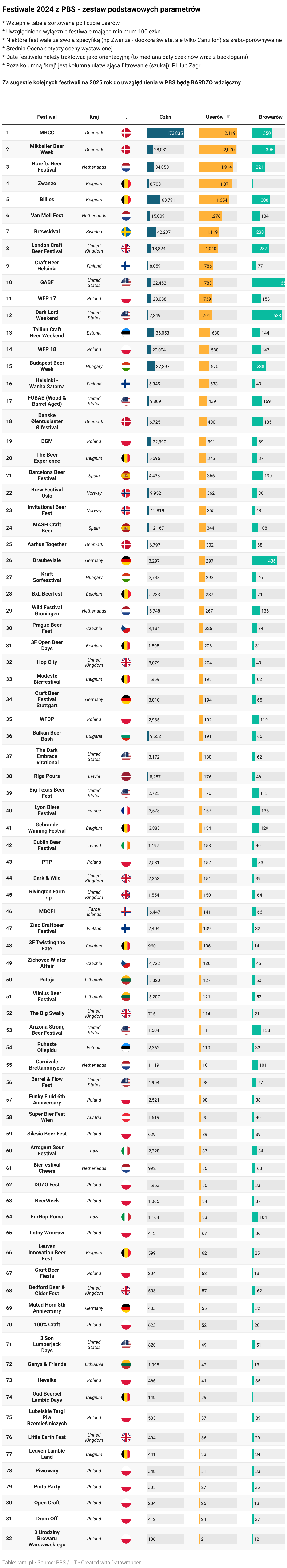 * Niektóre festiwale ze swoją specyfiką (np Zwanze - dookoła świata, ale tylko Cantillon) są słabo-porównywalne