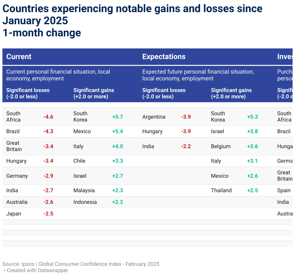 Countries experiencing notable gains and losses since January 2025 in Current Situation, Expectations, Investment and Jobs