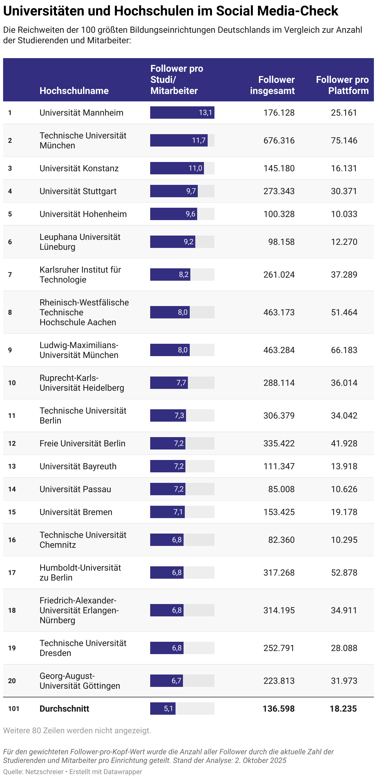 Die Reichweiten der 100 größten Bildungseinrichtungen Deutschlands im Vergleich zur Anzahl der Studierenden und Mitarbeiter: