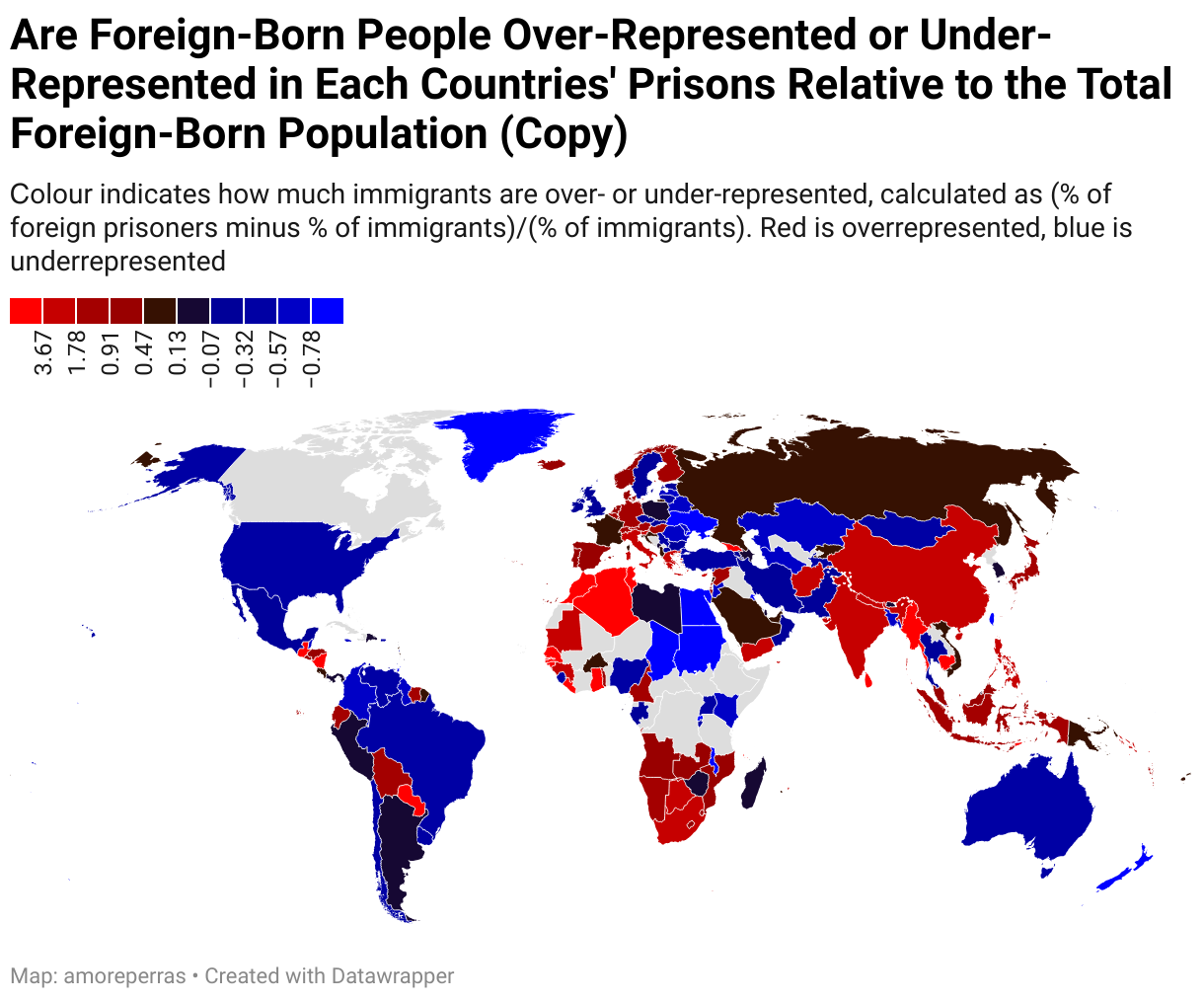 Сolour indicates how much immigrants are over- or under-represented, calculated as (% of foreign prisoners minus % of immigrants)/(% of immigrants).