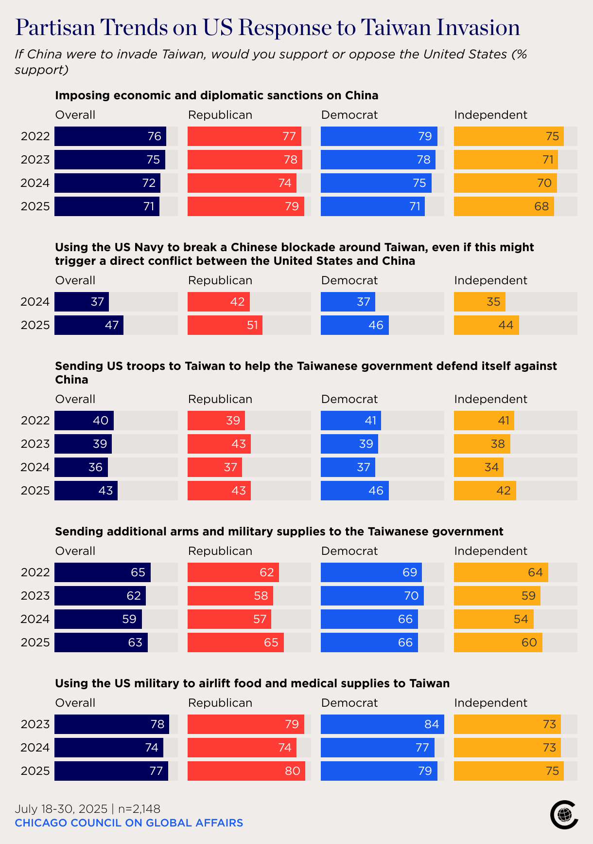 If China were to invade Taiwan, would you support or oppose the United States (% support)