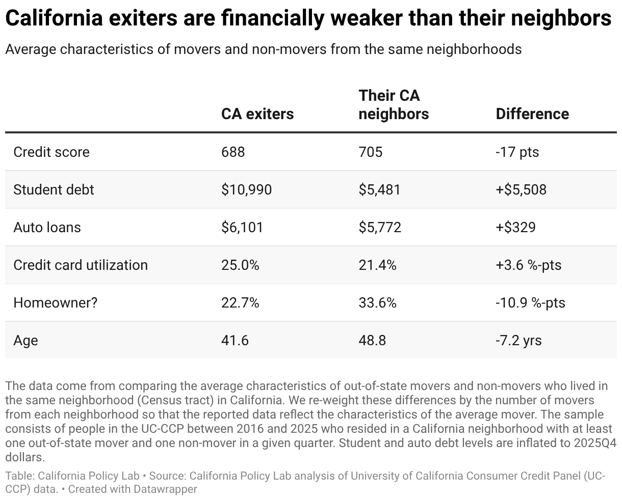 Table shows 3 columns related to finances for CA exiters vs. their CA neighbors, and what the difference is. Rows include credit score, amount of student debt owed, auto loan debt held, credit card utilization, homeownership rate, and age.