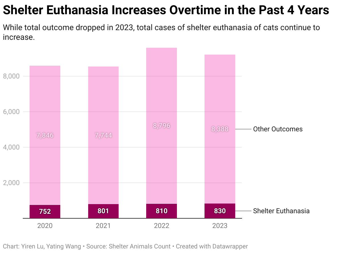 While total outcome dropped in 2023, total cases of shelter euthanasia of cats continue to increase.