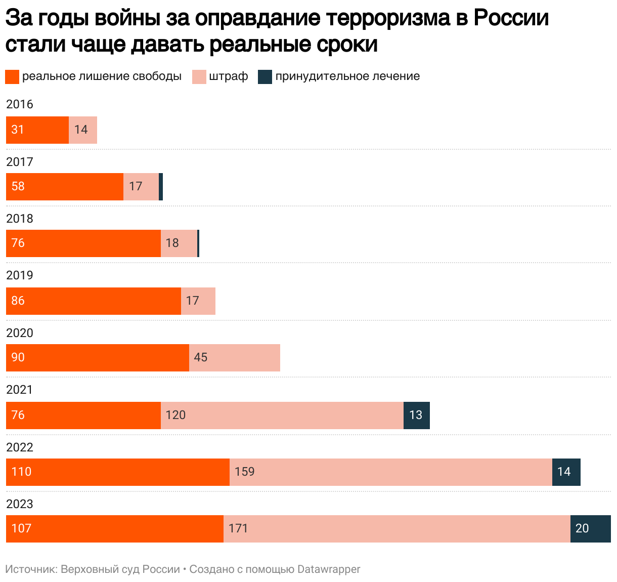 За годы войны за оправдание терроризма в России стали чаще давать реальные сроки