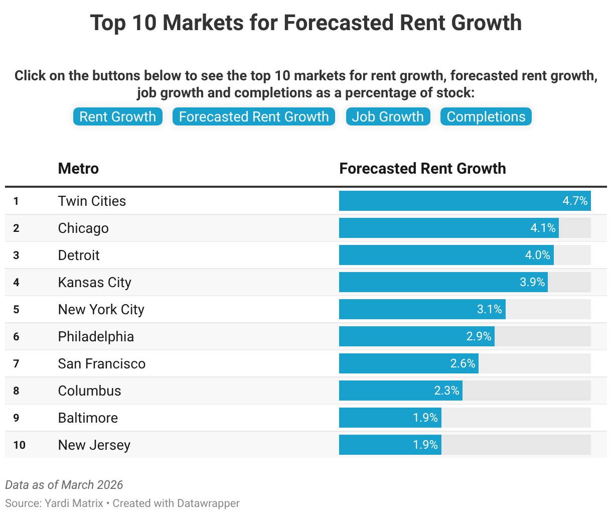 Click on the buttons below to see the top 10 markets for rent growth, forecasted rent growth, job growth and completions as a percentage of stock: