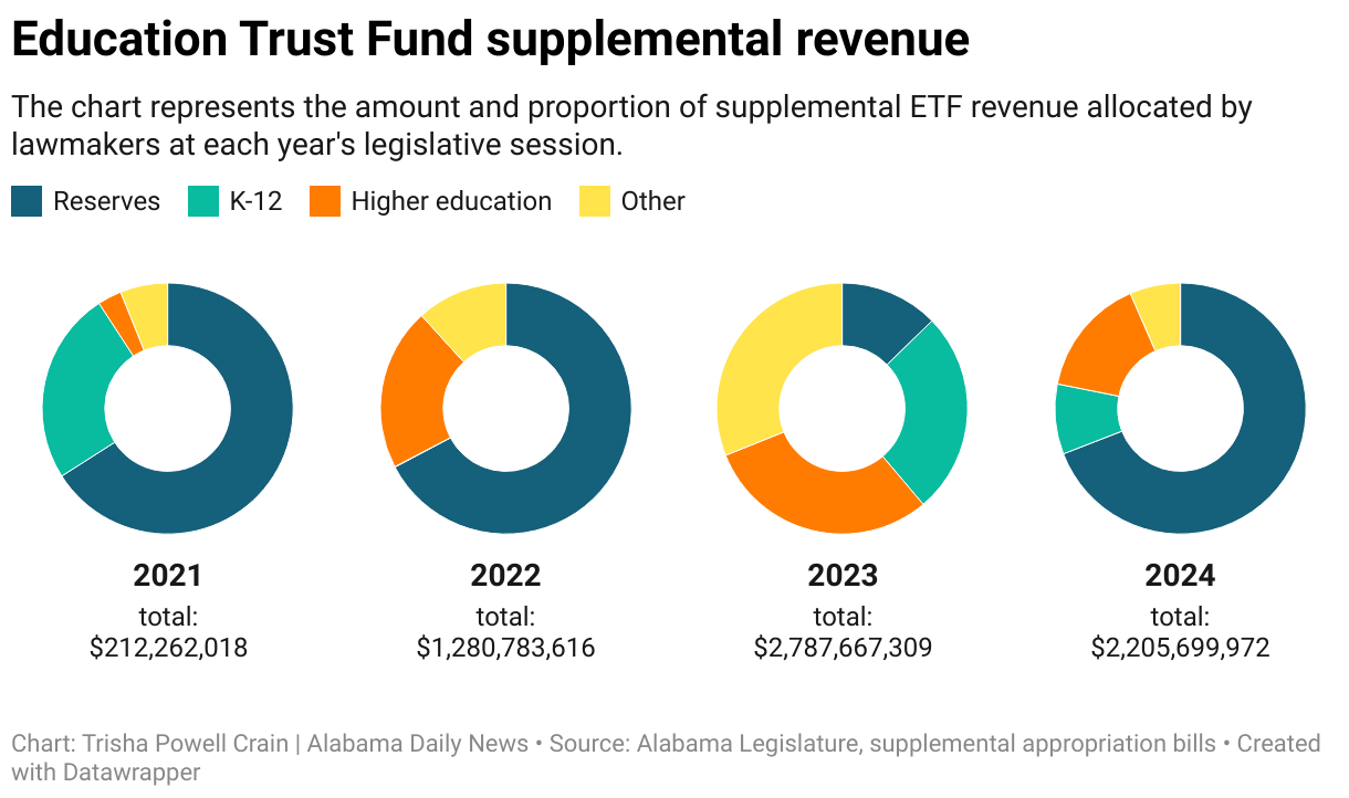 The chart represents the amount and proportion of supplemental ETF revenue allocated by lawmakers at each year's legislative session.