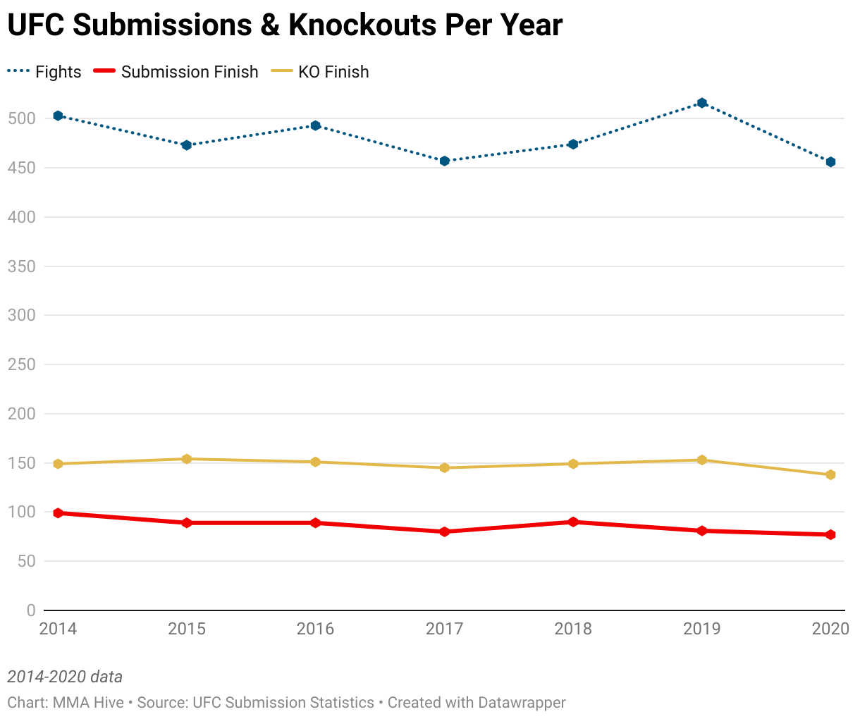 A line chart showing the number of fights, submissions, and knockouts per year in the UFC between 2014-2020