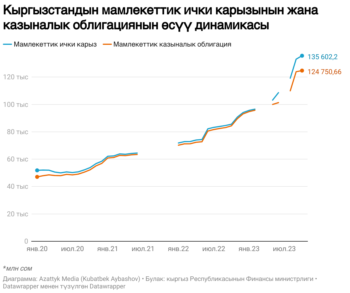 Кыргызстандын мамлекеттик ички карызынын жана казыналык облигациянын өсүү динамикасы