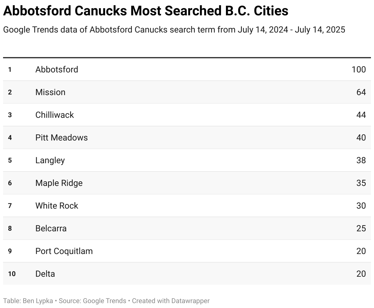 Google Trends data of Abbotsford Canucks search term from July 14, 2024 - July 14, 2025