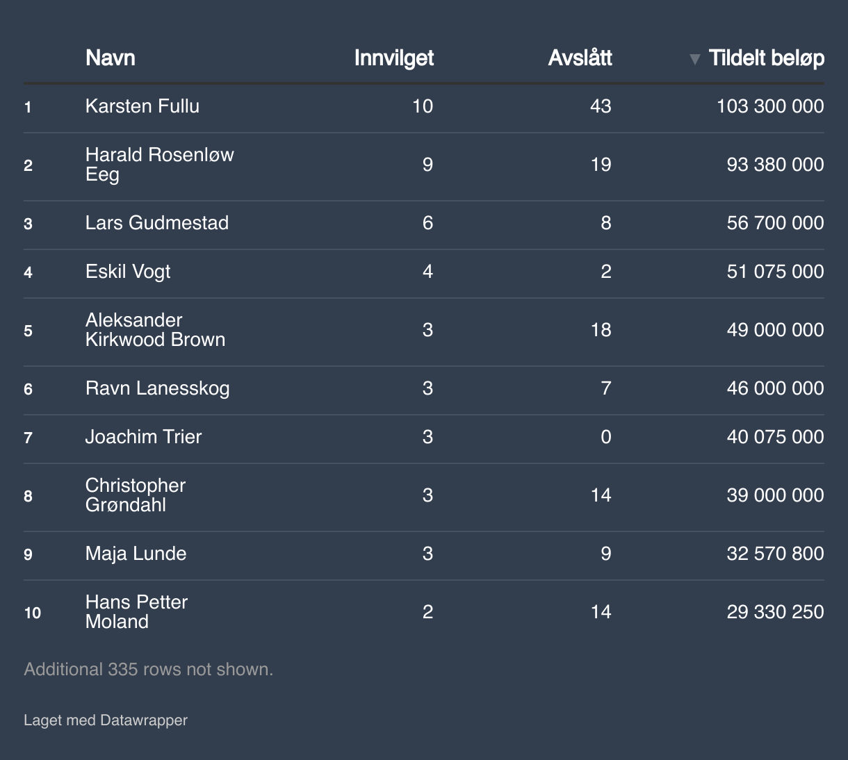 For hvert navn i tabellen telles antallet søknadsrunder den personen har vært involvert i. Et enkelt filmprosjekt kan gå gjennom flere runder med avslag hos NFI før det eventuelt får støtte til slutt. Datagrunnlaget gjør det ikke mulig å vise hvor mange unike filmer hver enkelt har søkt med. I kolonnen "Tildelt beløp" har hver person medregnet hele beløpet i en innvilget søknad, selv om filmen er listet med flere enn én produsent, regissør eller manusforfatter.