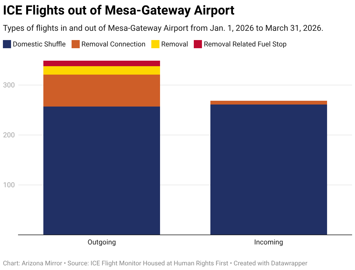 Types of flights in and out of Mesa-Gateway Airport from Jan. 1, 2026 to March 31, 2026.