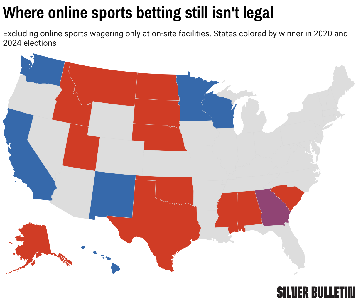 Excluding online sports wagering only at on-site facilities. States colored by winner in 2020 and 2024 elections