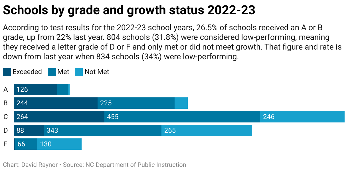 According to test results for the 2022-23 school years, 26.5% of schools received an A or B grade, up from 22% last year. 804 schools (31.8%) were considered low-performing, meaning they received a letter grade of D or F and only met or did not meet growth. That figure and rate is down from last year when 834 schools (34%) were low-performing.