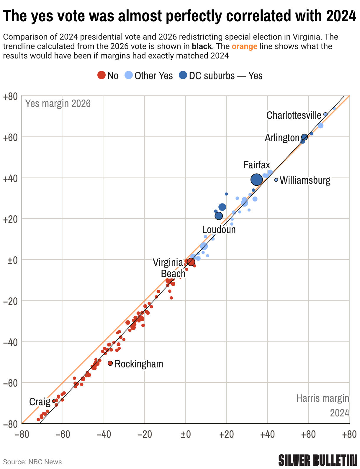 Comparison of 2024 presidential vote and 2026 redistricting special election in Virginia. The trendline calculated from the 2026 vote is shown in black. The orange line shows what the results would have been if margins had exactly matched 2024