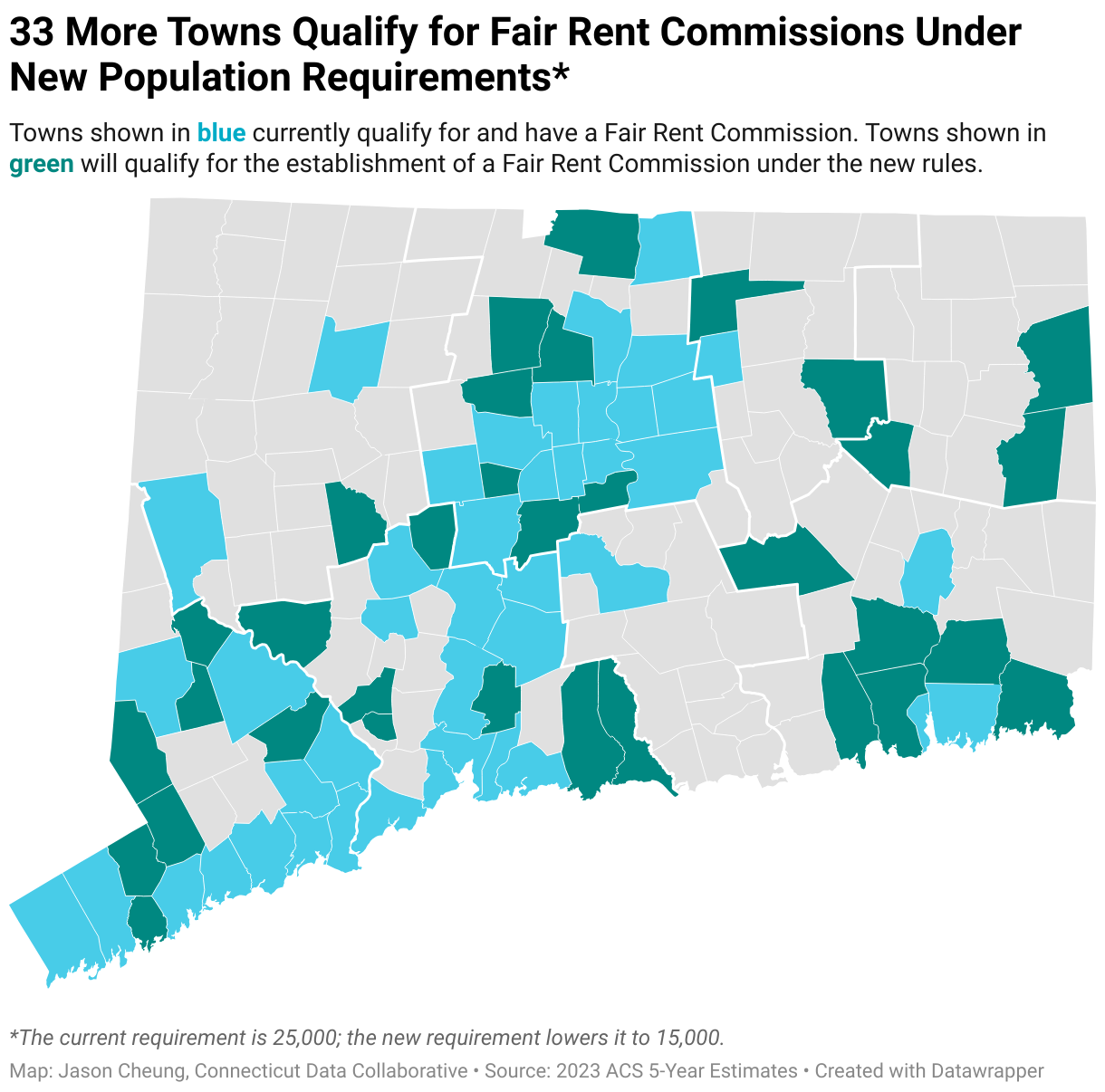 Towns shown in blue currently qualify for and have a Fair Rent Commission. Towns shown in green will qualify for the establishment of a Fair Rent Commission under the new rules.