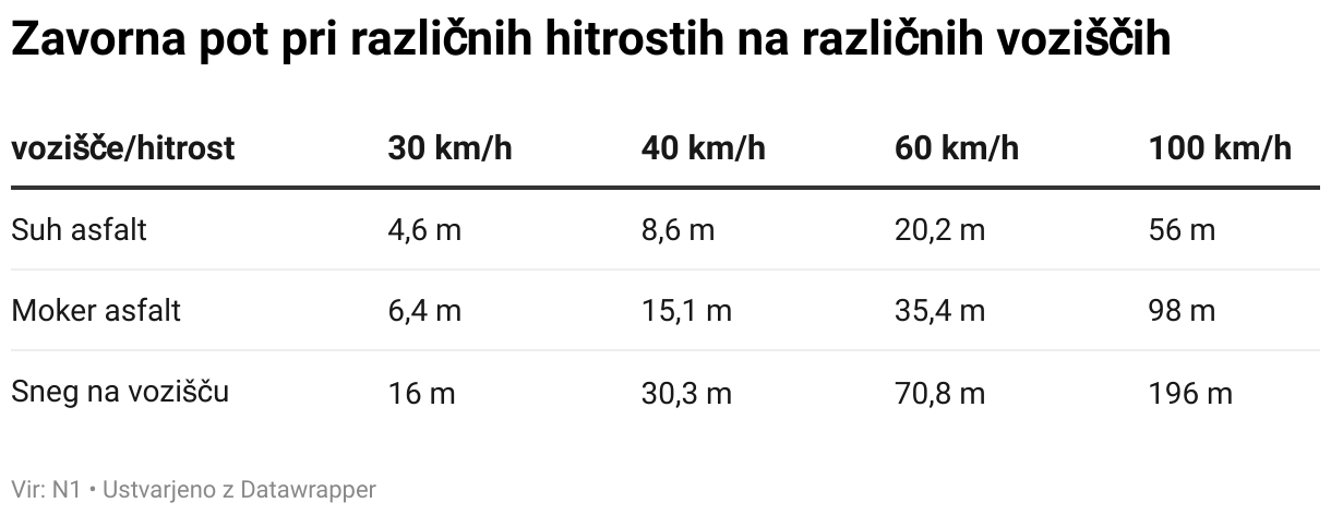 Zavorna pot pri različnih hitrostih na različnih voziščih