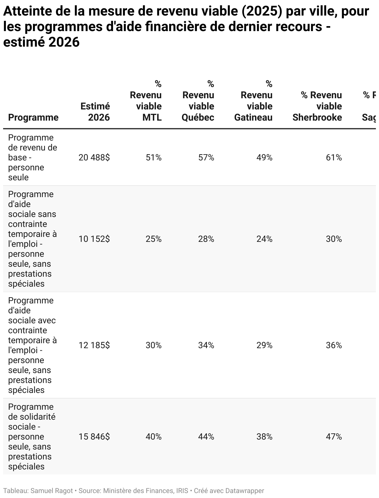 Atteinte de la mesure de revenu viable (2025) par ville, pour les programmes d'aide financière de dernier recours - estimé 2026