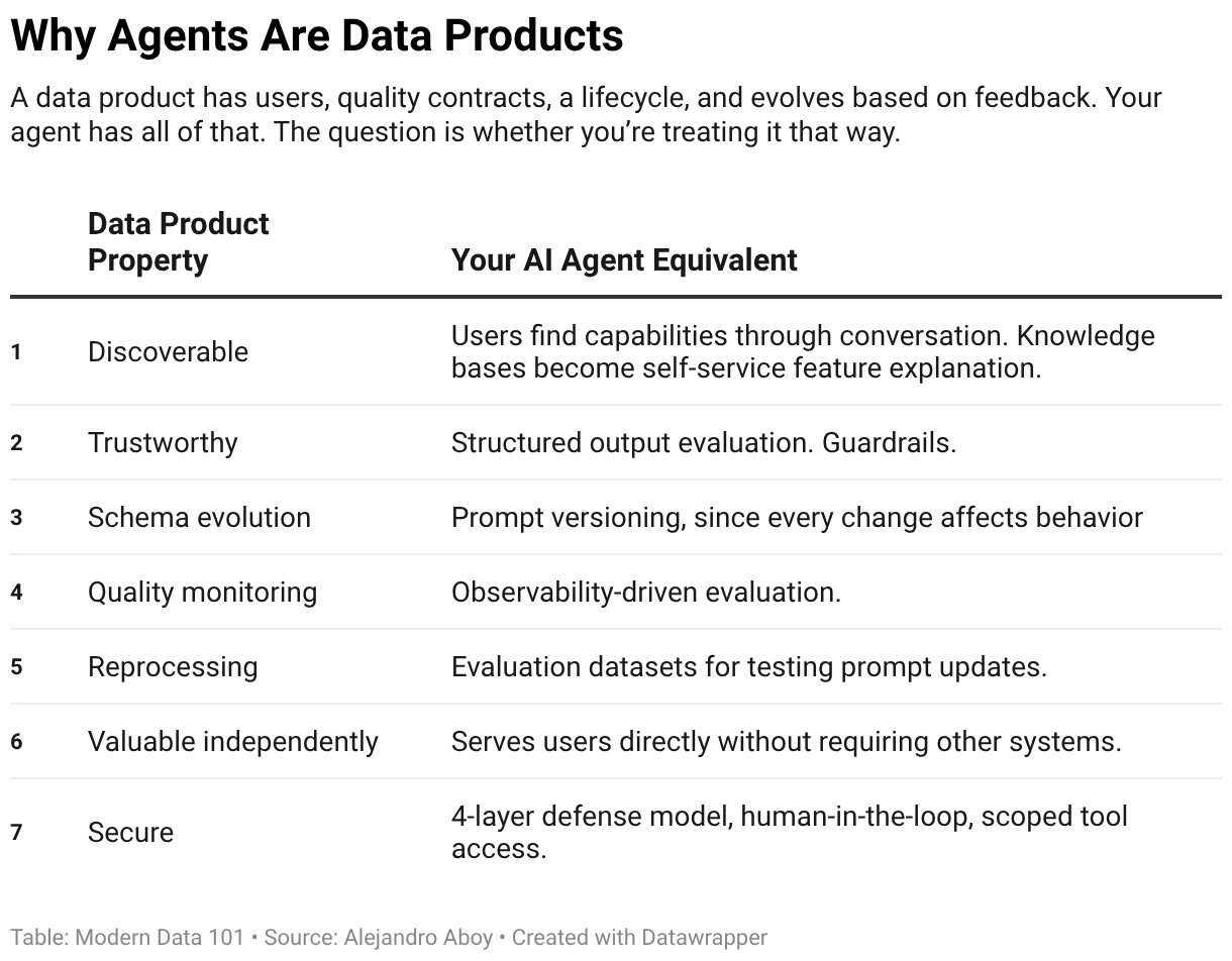 A data product has users, quality contracts, a lifecycle, and evolves based on feedback. Your agent has all of that. The question is whether you’re treating it that way.