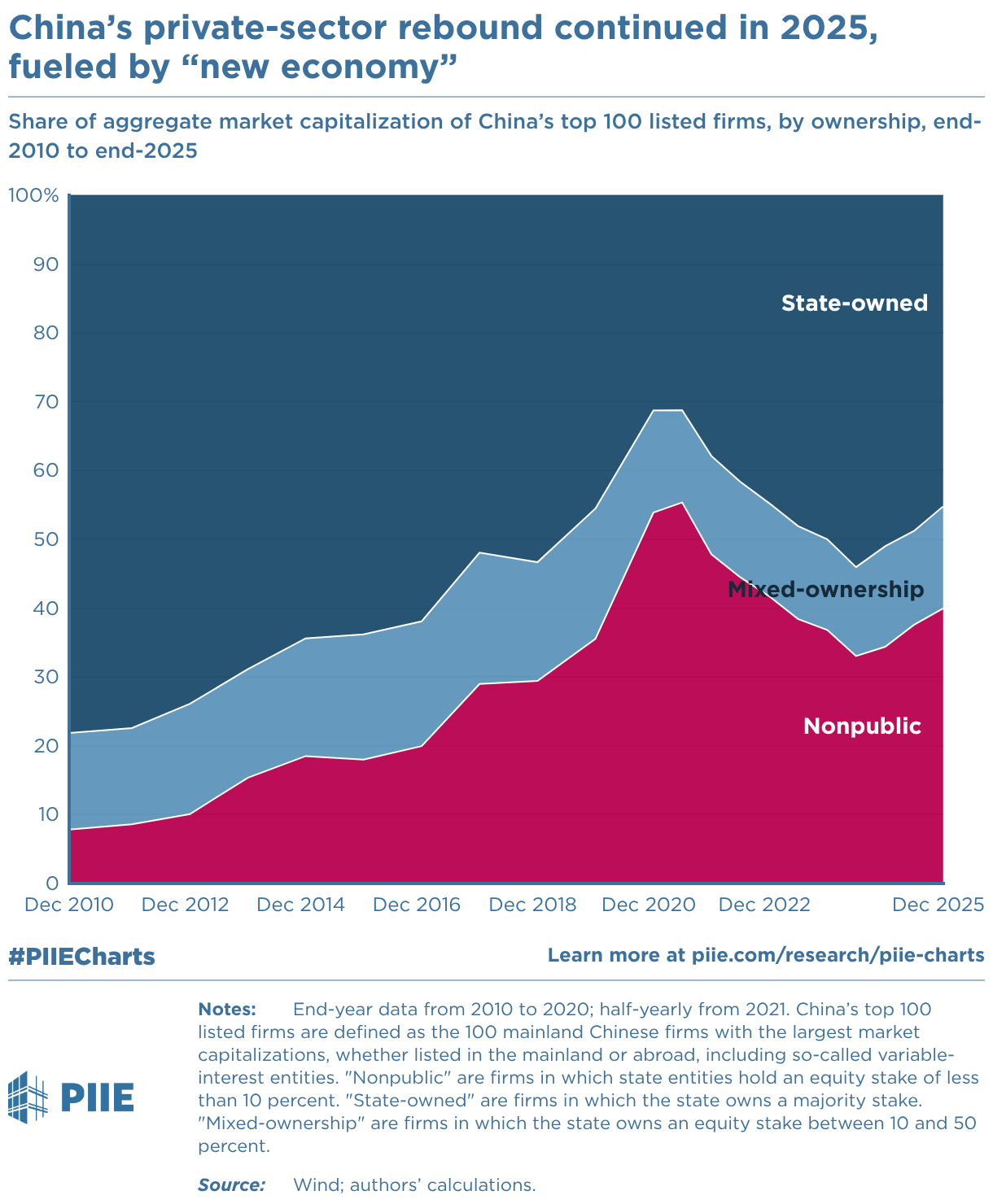 Share of aggregate market capitalization of China’s top 100 listed firms, by ownership, end-2010 to end-2025