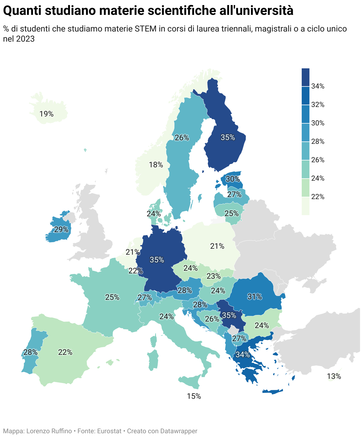 % di studenti che studiamo materie STEM in corsi di laurea triennali, magistrali o a ciclo unico nel 2023