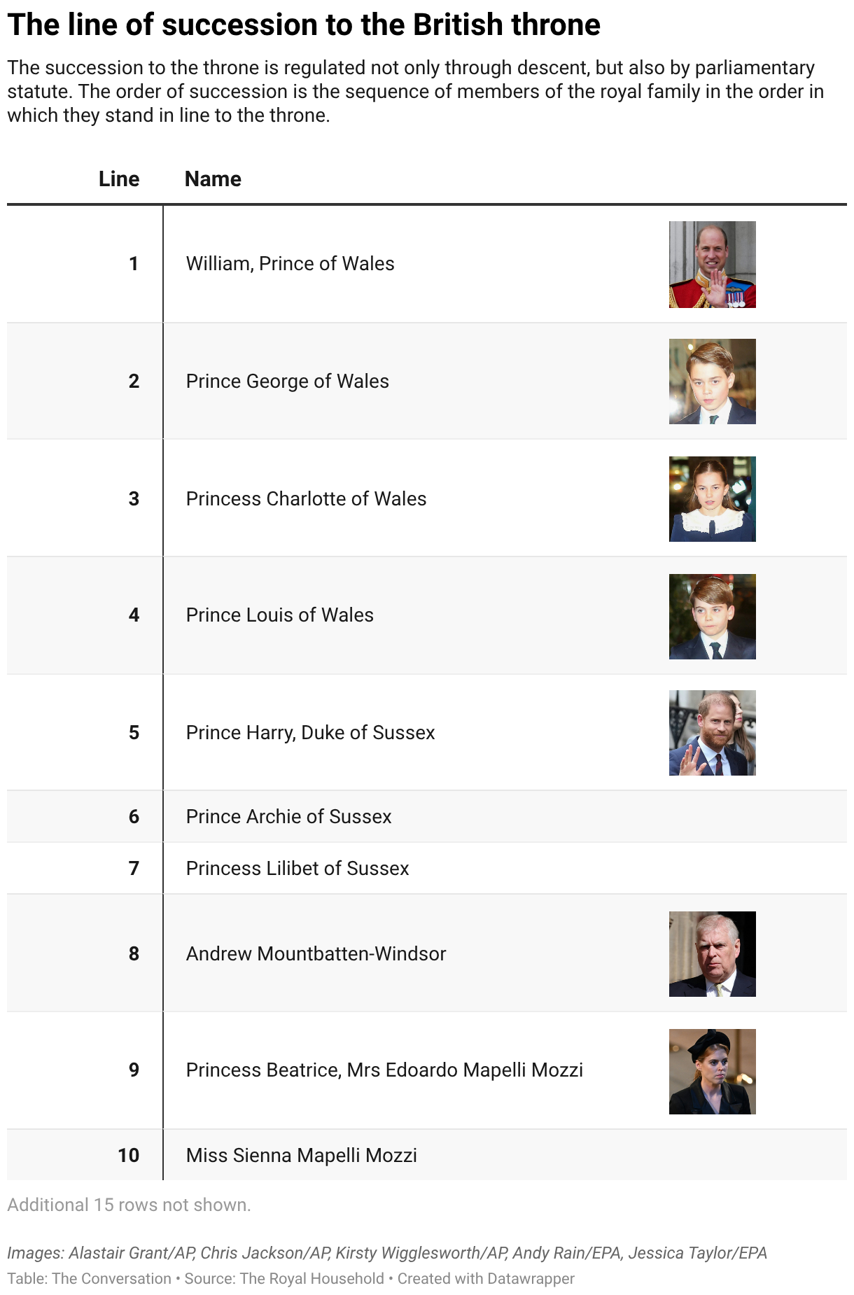 The succession to the throne is regulated not only through descent, but also by parliamentary statute. The order of succession is the sequence of members of the royal family in the order in which they stand in line to the throne.