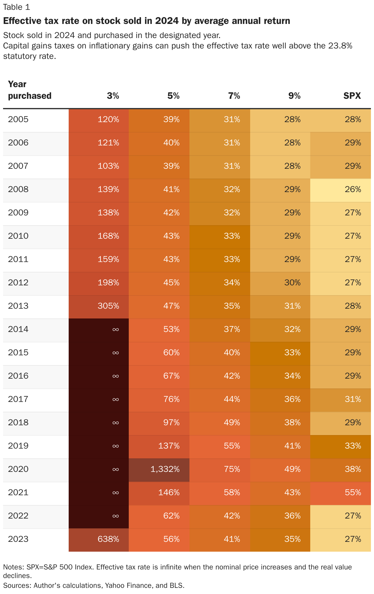 Stock sold in 2024 and purchased in the designated year. Capital gains taxes on inflationary gains can push the effective tax rate well above the 23.8% statutory rate.